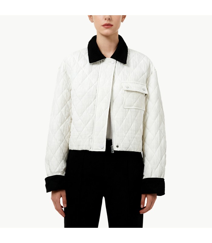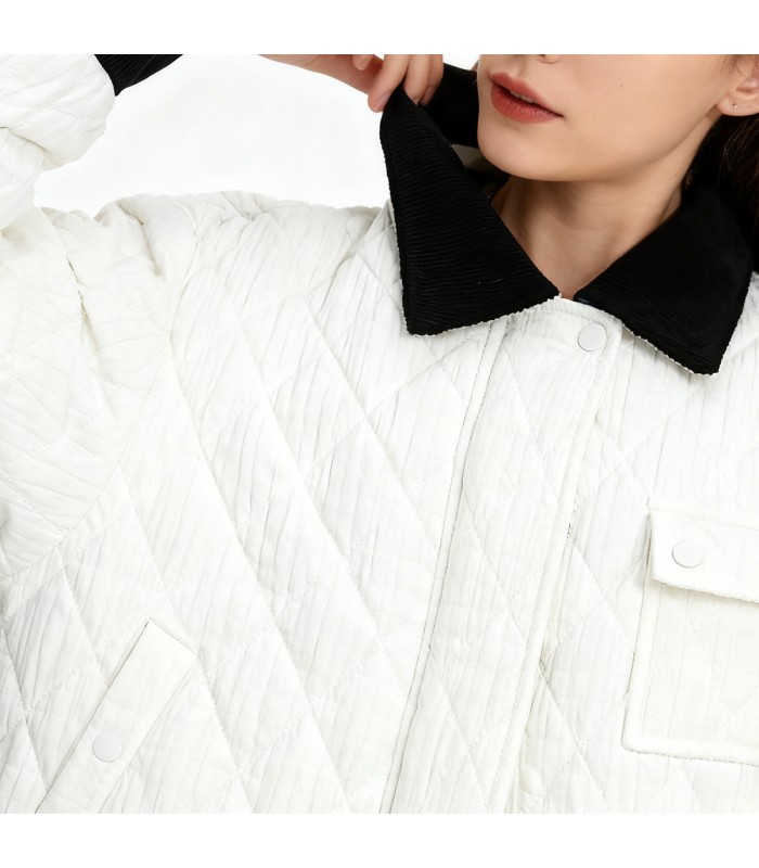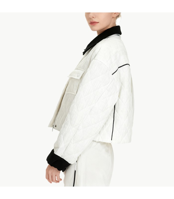 Material and Craftsmanship: This down jacket is made of nylon fabric, which is lightweight, durable, and windproof, while also possessing some wrinkle resistance and stability, making it suitable for frequent daily wear in winter. The interior is filled with high-quality down, which is fluffy, soft, and provides excellent warmth, offering stable temperature protection in cold weather. The entire fabric undergoes fine processing, making it less prone to down leakage and deformation, ensuring a comfortable and durable wearing experience.Color-blocked Lapel Design: The core highlight of this down jacket is its color-blocked lapel. The combination of contrasting colors and a three-dimensional lapel shape creates a more fashionable visual effect. The lapel design enhances the three-dimensionality of the neckline and can be paired with winter items such as turtlenecks and scarves for enhanced warmth; the color-blocking adds vibrancy and distinctiveness to the overall look, making this short down jacket even more trendy.Zipper Closure: The jacket features a smooth and durable zipper placket, which is easy to open and close, and provides a strong seal, effectively preventing cold air from entering. The clean, simple zipper design, paired with the cropped silhouette, creates a more streamlined and sophisticated look, adding practicality and a tidy appearance.Flap Pocket Design: A flap pocket on the left chest not only enhances the layering and design but also improves practicality, providing storage for small items such as cards, keys, and earphones. The flap pocket is a visual highlight, adding an outdoor casual vibe and stylish detail.Short Cut: The cropped silhouette of this down jacket features clean lines that visually elongate the waistline, creating a taller and more slender appearance. The cropped design is not bulky and allows for freedom of movement, making it ideal for commuting, daily outings, and sports activities. The lightweight and fluffy down filling provides warmth without compromising the figure.Color-Blocking Style: The overall design uses a solid color base with color blocking, combining simplicity and style. The color blocking adds a vibrant element to the down jacket, making it more suitable for pairing with jeans, cargo pants, casual pants, or skirts for a street-style and individualistic look. Whether commuting, daily student life, or winter outings, you can easily create a striking look.