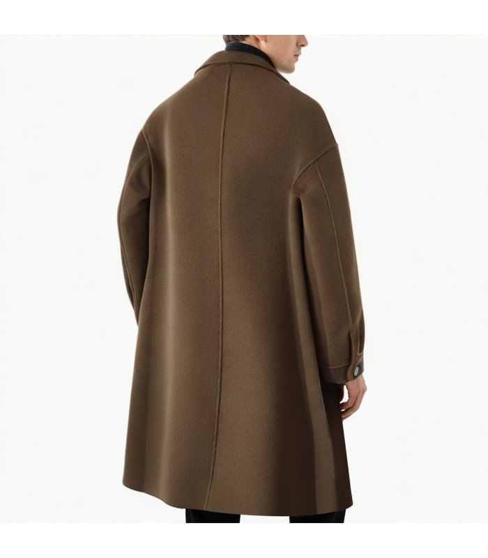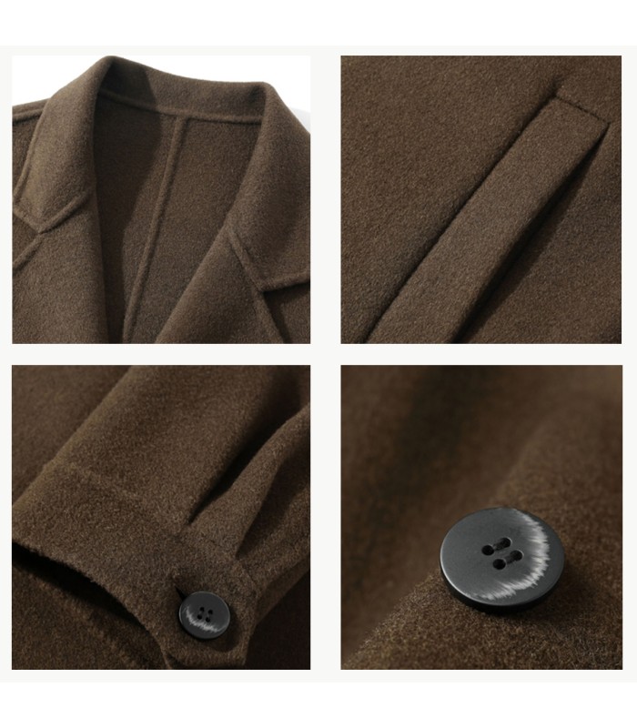 Premium Fabric: Made from a high-grade double-faced wool blend of 70% wool and 30% polyester, this coat boasts a thick, fine texture, a soft and smooth feel, and excellent warmth. The natural crimp of the wool fibers provides excellent insulation and breathability, keeping the coat lightweight and comfortable even in cold weather. The addition of polyester fibers enhances the fabric’s wrinkle resistance and crispness, making the coat more durable and less prone to deformation. The double-faced wool fabric is woven in two layers, ensuring a consistent texture inside and out. The unlined structure makes it lighter and more structured, showcasing a high-end craftsmanship.Notch Lapel Design: The classic notch lapel design features smooth lines that accentuate the sculpted shoulder and neck contours, highlighting a gentlemanly demeanor. The crisp, structured collar with a natural and elegant angle allows for both open and buttoned-up wear, combining formality and style. Whether paired with a turtleneck sweater or a shirt, it effortlessly showcases a sharp and sophisticated masculine style.Double-breasted design: The double-breasted placket design features a symmetrical and layered structure, adding a classic British style. The double-breasted buttons not only enhance the three-dimensionality of the front panel but also provide visual reinforcement, making the overall silhouette more upright and stable. High-quality buttons are full-bodied, securely stitched, and durable.Slightly dropped shoulders: The slightly dropped shoulders naturally extend the shoulder line, softening the formality and adding a casual and relaxed feel. The dropped shoulders maintain the coat’s crisp lines while increasing freedom of movement, making it suitable for layering with knitwear or suits, combining comfort and style.Puff sleeves: The puff sleeve design adds a fashionable element to the traditional coat cut. The slightly puffed shoulders and armholes create a natural, three-dimensional curve, adding visual depth and a modern feel. The subtle sleeve puffiness gives the overall silhouette a more fashionable presence, adding an elegant and soft tension while maintaining a masculine look.Side Slanted Pockets: Concealed slanted pockets on both sides feature a clean and streamlined design, combining practicality and aesthetics. The ergonomic angle of the pocket openings allows for easy and natural hand placement for warmth. The pocket linings are made of a fine, durable fabric with neat and sturdy stitching, enhancing the overall quality.Mid-Length Cut: The mid-length cut effectively elongates the figure, flattering the silhouette and creating a sleek and elegant look as you walk. Covering above the thighs, the coat ensures warmth while maintaining a light and agile feel, making it an ideal choice for autumn and winter, balancing warmth and style.Double-Faced Wool Construction: Utilizing advanced double-faced wool technology, both sides can be independently formed, with no lining or grouting. The seams are finished by hand, with meticulously concealed stitches. This double-faced wool construction gives the coat a lightweight and structured feel, showcasing a simple yet elegant and sophisticated texture.Suitable for various occasions: Whether it’s urban commuting, business meetings, or weekend outings and leisure activities, this double-breasted, double-faced wool men’s coat can be easily styled. Pair it with a turtleneck sweater and dress trousers for an elegant and gentlemanly look, or with a knit sweater and jeans for a relaxed yet sophisticated feel, showcasing the multifaceted charm of men in winter.