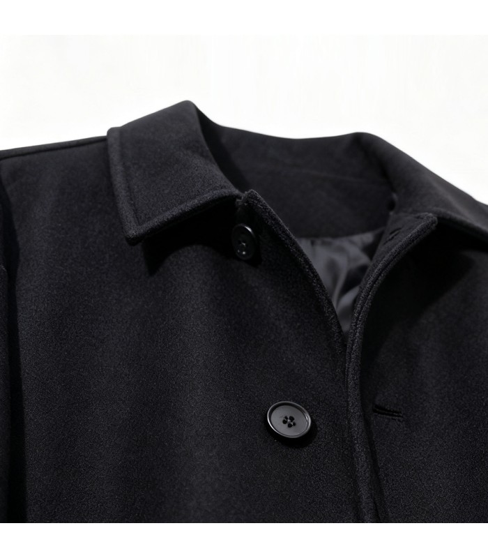 Premium Fabric: Made from 100% polyester wool fabric, this coat is thick, crisp, and smooth to the touch, offering excellent warmth and durability. Polyester wool fabric is highly stable, resistant to deformation and wrinkling, and boasts excellent wind resistance and lasting crispness. The fine wool texture adds visual depth, combining a comfortable feel with a structured silhouette, showcasing the elegant quality and practicality of this winter coat.Lapel Design: The classic lapel design exudes a gentlemanly air, highlighting a clean and sharp shoulder and neck line. The collar stands upright and is resistant to sagging, allowing for both open wear for a relaxed look and buttoned-up for enhanced warmth. Whether paired with a shirt, turtleneck sweater, or knitwear, it creates a sophisticated and stylish winter look.Single-Breasted Placket: Featuring a simple single-breasted design, the buttons are arranged in a harmonious proportion with clean, flowing lines. The placket opens and closes smoothly, facilitating easy on and off while maintaining the coat’s crisp silhouette. The classic placket design lends a clean and sophisticated look, highlighting the urban man’s capable and refined style.Side pockets: Concealed side pockets on both sides combine aesthetics and practicality. The pocket openings are positioned to fit natural hand gestures, making it easy to retrieve items or slip your hands in for warmth. The pocket fabric is made of a fine, durable material with neat and strong stitching, enhancing the overall lifespan and refinement.Back panel design: The back features a panel cut, enhancing the garment’s structure and three-dimensionality, allowing the coat to better conform to the body’s curves and drape naturally with movement. The panel not only adds visual depth but also provides support and prevents deformation, strengthening the overall silhouette.Mid-length cut: The mid-length cut flatters the figure, effectively protecting against the cold wind while balancing warmth and style. The length covers above the thighs, visually elongating the figure and suitable for all body types. The crisp lines and flowing hem create an elegant and streamlined winter silhouette.Solid Color Design: Featuring a solid color scheme, the understated elegance highlights the mature and refined temperament of the urban man. It’s easy to pair with various inner layers and trousers, presenting a versatile and sophisticated look suitable for multiple occasions.Detailed Craftsmanship: Utilizing precision stitching and high-density overlock stitching, the shoulder lines, collar, and placket are seamlessly integrated. The smooth, close-fitting lining ensures comfortable and unrestricted wear. Buttons are securely fastened, and the meticulous stitching of the inner lining guarantees durability and long-lasting crispness.Suitable Occasions: Whether for winter commutes, business meetings, urban leisure, or dates, this mid-length wool coat is versatile and easy to wear. Pair it with a shirt and dress shoes for a gentlemanly look, or with a sweater and casual trousers for a relaxed and elegant style. It’s a classic and versatile piece for your winter wardrobe.