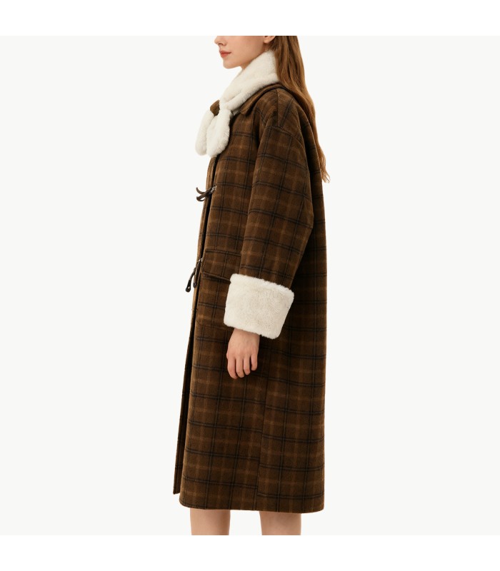 Material and Craftsmanship: This women’s coat is made from high-quality wool fabric, thick and structured, durable and wear-resistant, while feeling soft and comfortable to the touch. The fleece lining enhances overall warmth, keeping the wearer warm in autumn and winter. The exquisite plaid pattern enhances visual depth and style.Lapel Design: The classic lapel design is elegant and adds to the coat’s layering, while also facilitating layering with shirts or turtlenecks, enhancing the overall look and warmth.Toggle Button Placket: The toggle button design is retro and sophisticated, adding a detail to the coat while also being practical, making it easy to put on and take off, and enhancing the overall style.Hand Pockets: Two hand pockets are convenient for storing small everyday items or for naturally resting hands, while also enhancing the coat’s layering and functionality, improving overall practicality.Mid-Length Fit: The mid-length design provides good coverage and warmth, elongating the figure and creating an elegant and sophisticated feminine silhouette, while balancing practicality and style.Plaid Design: Plaid patterns add a modern touch and visual interest to classic wool coats, making the overall look more vibrant and stylish while highlighting individual style.Casual Occasions: Pair with a knit sweater, jeans, or casual trousers for a warm and comfortable everyday look.Formal Occasions: Layer with a shirt or turtleneck sweater, paired with dress pants or a skirt for a sophisticated and elegant style.Winter Layering: Layer a sweater or lightweight down jacket under the coat for added depth and warmth.