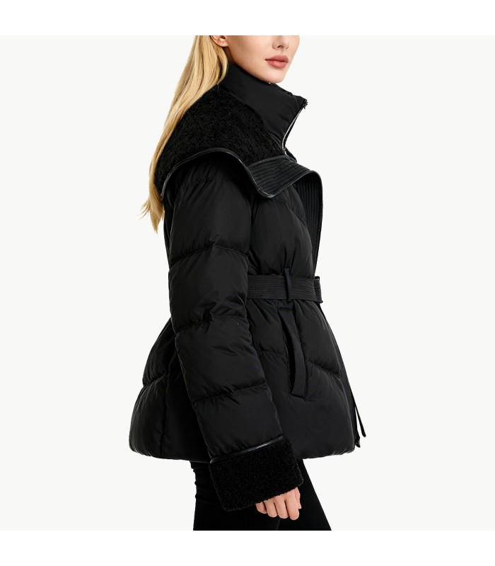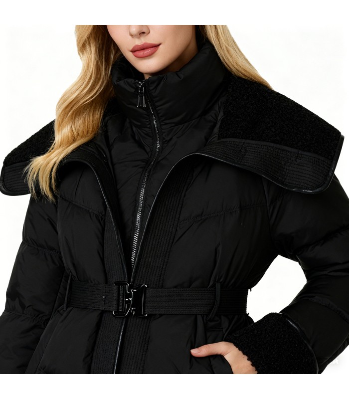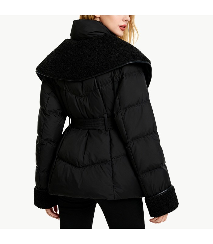 Material and Craftsmanship: This women’s down jacket is made of 100% polyester fiber fabric, which is wear-resistant, windproof, and has good wrinkle resistance and stability, making it suitable for frequent daily wear. The interior is filled with high-quality duck down, which is lightweight, warm, and highly lofty, providing excellent warmth in winter. The entire fabric undergoes fine processing, making it less prone to down leakage and deformation, ensuring comfort and durability.Large Lapel with Lambswool Design: The biggest highlight of this down jacket is the large lambswool lapel, which is soft, fluffy, skin-friendly, warm, and comfortable to the touch. The large lapel not only enhances the overall style and presence visually but also provides extra warmth for the neck in winter, eliminating the need for a scarf to protect against the cold wind, combining aesthetics and functionality.Waist-cinching Design: The waist features a fitted cut or adjustable design, effectively modifying body proportions and creating an elegant and slender waistline. Compared to regular straight-cut down jackets, it is more slimming and feminine, making the overall look more streamlined and upright.Zippered Placket: Features a smooth and durable zippered placket for easy on and off, while the zipper structure effectively prevents cold air from entering. The placket design maintains a clean and streamlined overall look, enhancing practicality.Fit: Mid-length or regular length design, combining warmth with a flattering fit. The overall lines are smooth, and the large lamb’s wool collar and cinched waist enhance the silhouette, making this down jacket both warm and stylish.Solid Color: The solid color design is simple and versatile, highlighting the texture of the fabric and lamb’s wool collar. It’s easy to pair with various trousers, skirts, and winter shoes, effortlessly creating looks for everyday wear, commuting, or dates.