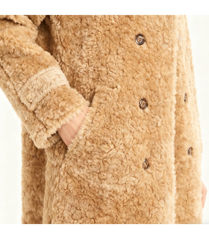 Material and Craftsmanship: This coat is made from premium lambswool fabric, which is soft, thick, and warm to the touch. The fabric is crisp and maintains its shape even after long-term wear, offering both comfort and durability. The natural fluffiness of the lambswool enhances warmth while adding a vintage and sophisticated feel.Round Neck Design: The simple and elegant round neckline accentuates the neck and creates a clean and crisp silhouette. The unadorned round neck is versatile and easy to wear, pairing well with various innerwear, balancing casual and elegant styles.Double-Breasted Closure: The double-breasted design at the front is classic and elegant, easy to put on and take off, and enhances the sense of layering and visual crispness. The double-breasted design complements the fluffy texture of the lambswool, presenting a classic vintage style.Mid-Length Fit: The mid-length cut covers the hips and upper thighs, providing excellent windproof warmth while also flattering the figure. Straight-leg or slightly cinched-waist designs balance comfort and style, creating an elegant winter silhouette.Solid Color Design: The entire garment is made of solid-color fabric, simple and elegant, easy to match with various bottoms and shoes. The versatile design suits multiple styles, easily adaptable to urban commutes and casual everyday wear.Styling Suggestions: Pair with slim-fit jeans, casual pants, or skirts; layer with knitwear or turtlenecks; and wear with ankle boots or heels for an effortlessly retro-warm or urban-modern look.Suitable Occasions and Functionality: Ideal for autumn and winter wear, balancing warmth and retro style. Suitable for: everyday casual wear, commuting to work, dates, parties, and winter outings, embodying warmth, elegance, and a retro charm.